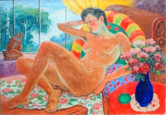 中国现代艺术大师潘玉良,“窗前女人体”,1946年,布面油彩,64X92厘米,安徽省博物馆藏。该作的色彩明显来自野兽派,红、黄、蓝的高亮大片单色块分割了背景,表现出强烈的装饰性;作为画面主体的人物反用低明度的暗色调,仅在局部以强劲线条勾勒,使画面呈现出超越自然的趣味性