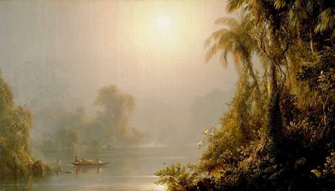 美国哈德逊河画派大师丘奇,“早晨的热带丛林”,1858年,美国沃尔特艺术博物馆藏。哈德逊河流域的热带雨林,雾霭厚重湿润,太阳升起老高,才刺破这
