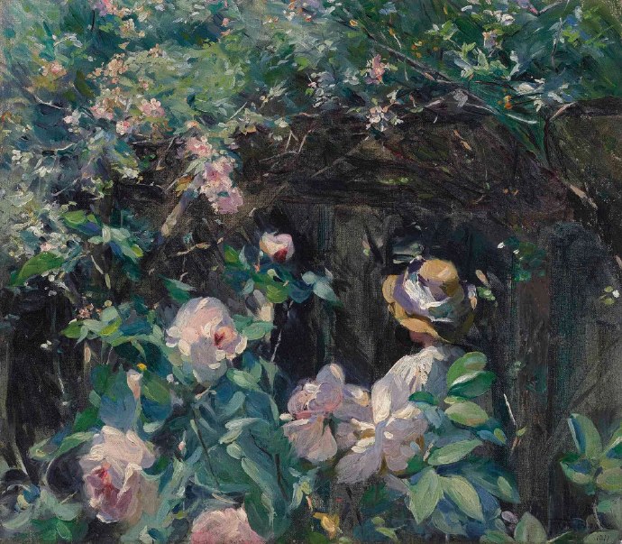 Frank Bramley (英, 1857–1915), 在门口 1911,37.8 x 43.2 cm