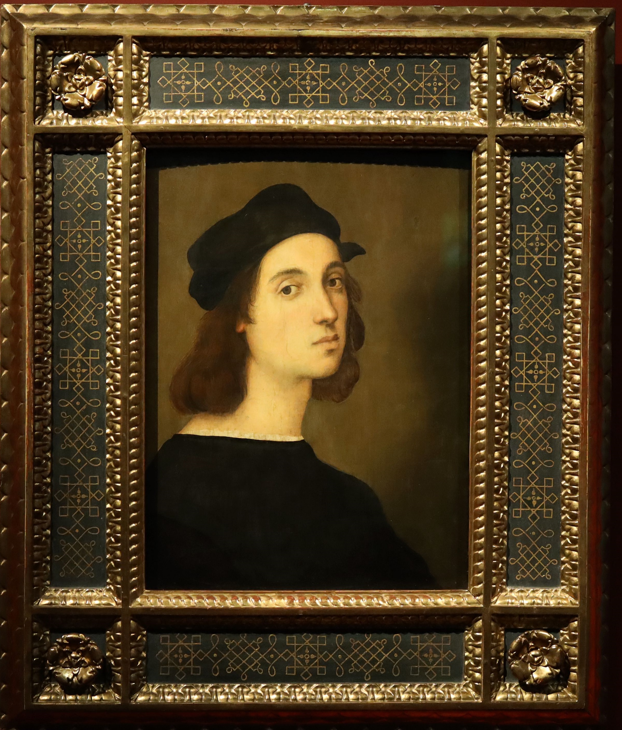 在这幅半身像中,拉斐尔披着一头栗色的齐肩长发,头戴一顶帽子,一双乌黑的眼眸注视着观众,脸上流露出专注而忧郁的神情。他身穿当时流行的朴素衣着。科学研究证实,这幅画拉斐尔未打草稿,一气呵成。