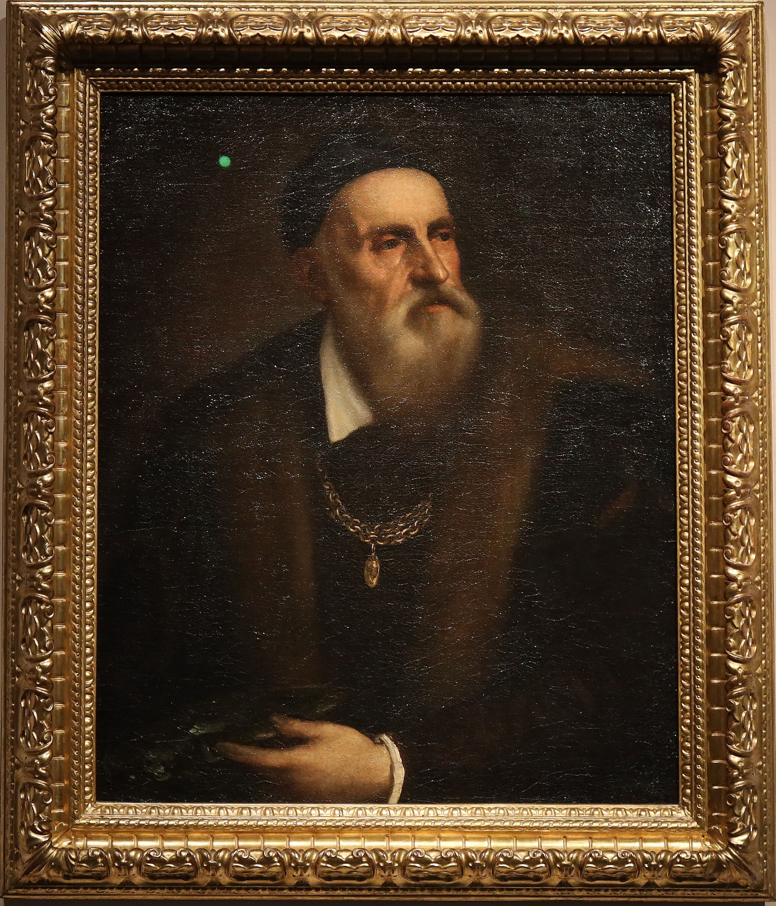 本幅作品直至20世纪一直被学者认定为提香的真迹,但最近有学者将它归为提香侄子马可.维切洛的作品,他是大师去世后继续经营画室的门徒之一。他汲取了提香对于色彩的卓越认知,只用少量色调着色:黑色和棕色的衣帽、苍白的肤色、银灰色的胡须及白色的衣领跃然纸上。提香意气风发地站立着,凝视着画外的远处,布满皱纹的脸上带着思索和自信的表情。晚年的提香享誉欧洲宫廷,备受王公贵族的欢迎,这幅画充分彰显了他的显赫地位。