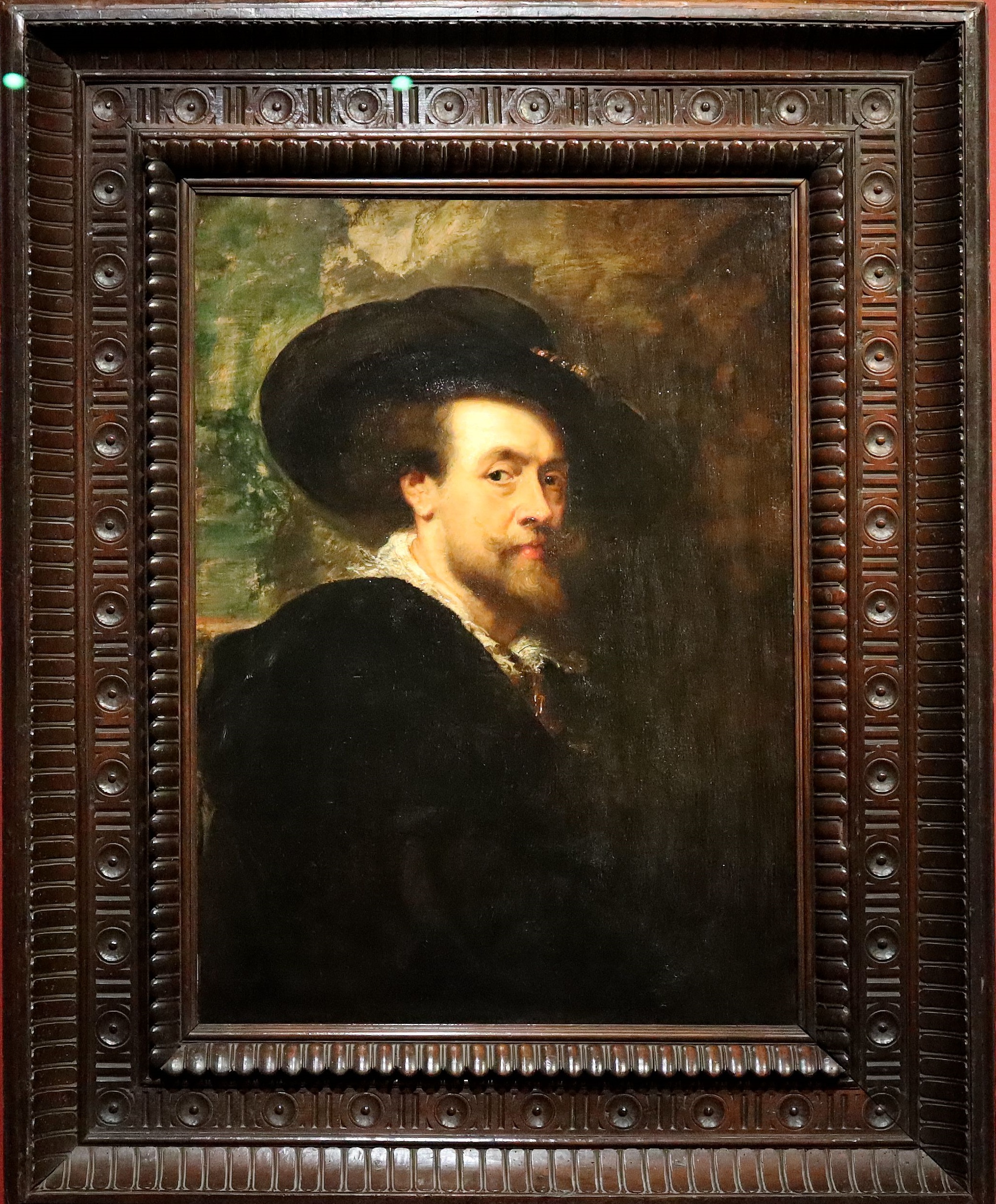 这是"弗拉芒画家王子"鲁本斯的著名杰作。17世纪初,他活跃在意大利,为巴洛克风格诞生做出了巨大贡献。随后的大半个世纪,奢华浮夸的巴洛克风格始终流行于欧洲的宫廷,这幅自画像将巴洛克风格展露得淋漓尽致。回到弗兰德斯后,处于事业巅峰的鲁本斯在46岁时绘制此画。画中他呈四分之三侧身角度,络腮胡勾勒出面部轮廓,头戴宽檐帽遮盖脱发,颈上戴一条金项链,彰显其尊崇的社会地位,这也是奥地利统治者和丹麦国王授予他的荣誉。