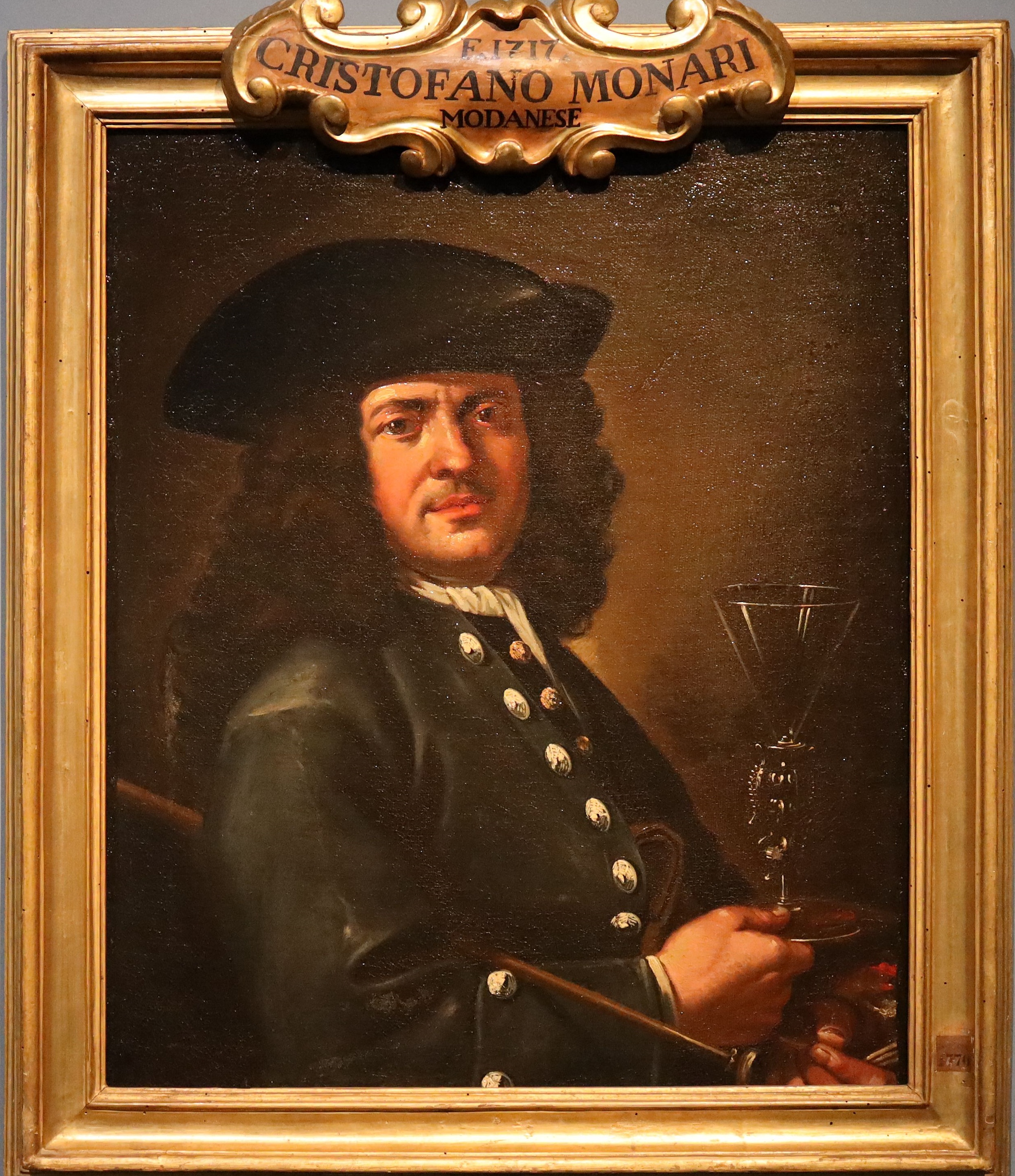 穆纳里创作这幅自画像时,已届不惑之年,正处于事业巅峰,在美第奇宫廷中享受着美好生活。他面带微笑,气定神闲,穿着考究,头戴一顶黑色三角帽,身穿钉有银色纽扣的深色夹克,马甲上缀以金色纽扣,领子带有褶皱花边。他胳膊下夹着一根作画时用来支撑前臂的腕杖,左手拿着画笔和调色板,右手举着一个在贵族餐桌上常见的雅致玻璃杯,似乎带有一丝炫耀的意图。