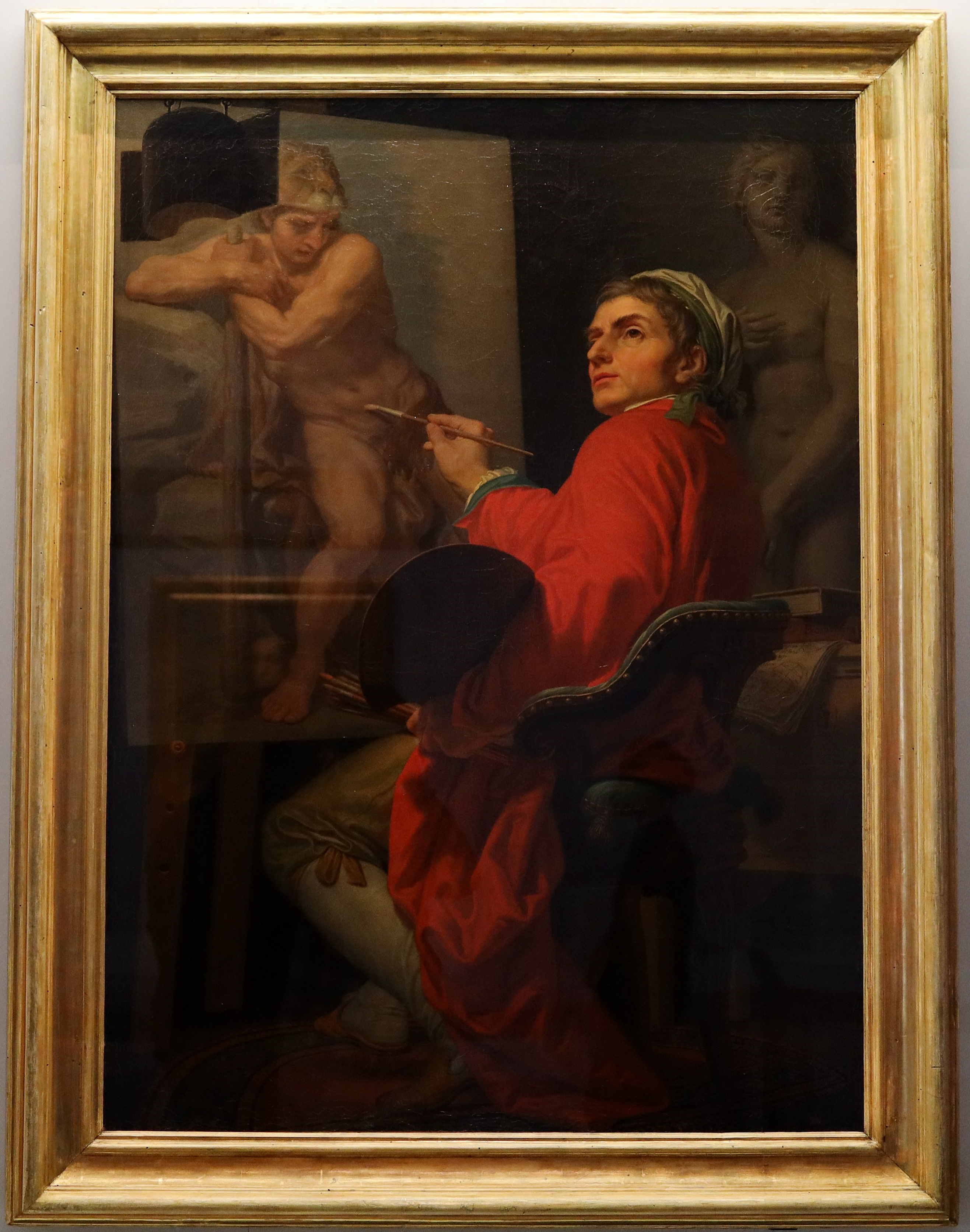 这是一幅特写,人物身体向前倾斜,脖子前伸,双眼凝视前方,最后这点甚至招来了一些评论,认为画中人物的眼神带有些许迷茫不安。出现这种神情也许是因为画家专注地盯着镜中的自己,想要捕捉自身的每一个细节,包括因伤疤而扭曲的右脸,在现实中,那是画家二十六岁时在击剑中受伤留下的印迹。在其几幅著名的作品中,大卫擅长简洁有力的叙事方式、刻画庄重的人物表情并按照严谨的几何原则构建的稳固构图,但在这幅自画像中,观者很难找这类风格的痕迹。我们可以假设,这是画家率意而为的自画像习作。