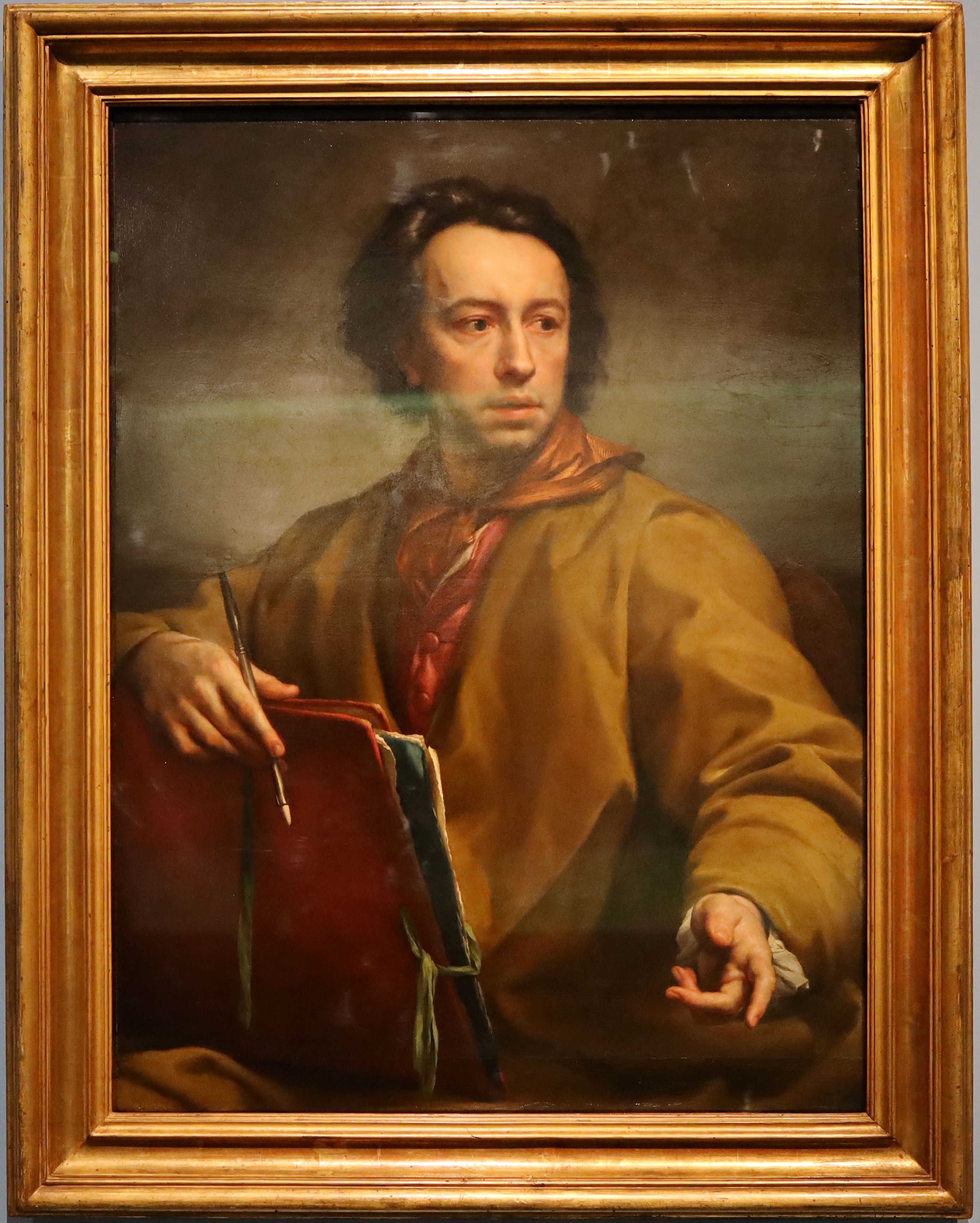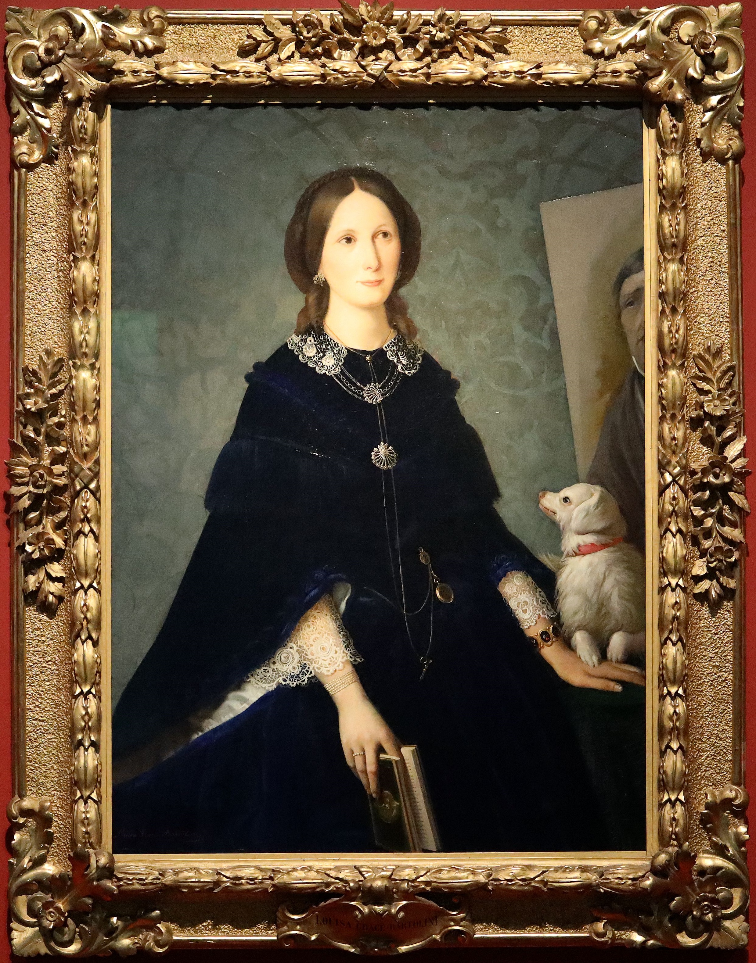 严格来讲,这幅肖像并不能认定为画中画,它也许是一面用天蓝色缎带悬挂在钉子之上的镜子。倘若如此,我们所见的是画家将外部世界在画中再现。物体和视线交错重叠,在画布之中,或在画布之外,亦或呈现于观者面前。如果我们回到右下角木箱上标记的日期1789年的同一场景,甚至可能"触碰"到正在记录这一切的画家。