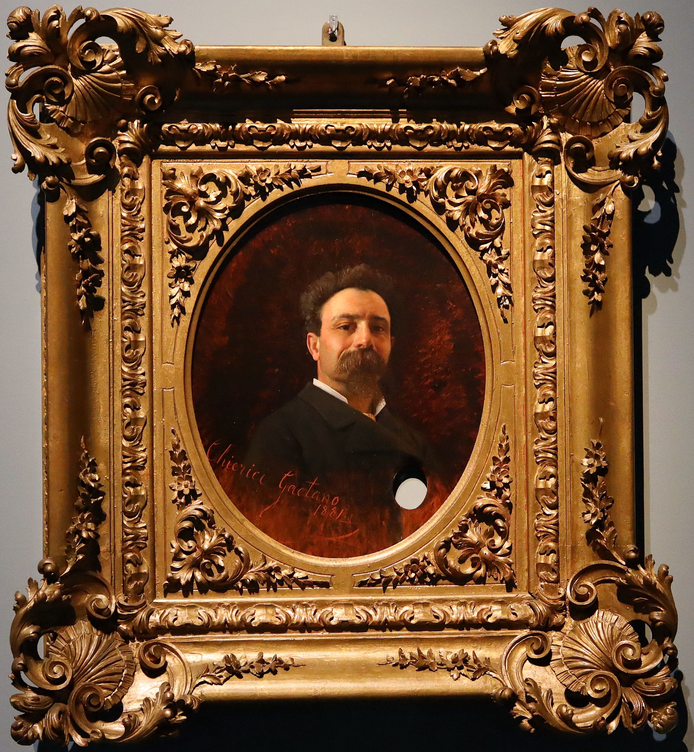 1882年,加埃塔诺·基耶里奇接管了位于家乡雷焦艾米利亚的"皇家画师绘画学院。而在一年前,基耶里奇完成了这幅自画像,这是他职业生涯的巅峰期,刚凭借在伦敦皇家艺术学院展出的一幅油画赢得了英国观众的喜爱。画家向我们展示了一个踌躇满志、意气风发的自己,身上散发的张扬自信呼之欲出,与他的代表性作品中对日常琐事的入微刻画形成鲜明对比。