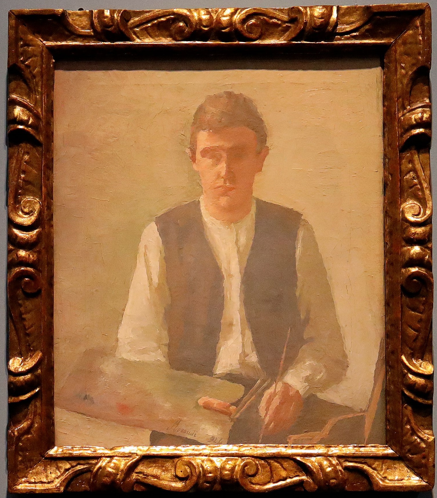在这幅自画像中,35岁的莫兰迪身穿衬衫和马甲,目光专注,仿佛全神贯注于用平淡柔和的色调将自己的象转化到画布上。他的手中拿着绘画工具,分别是标有日期、签名的调色板和一些画笔。空旷且色调统一的画作背景让人想起精致的18世纪法国艺术,尤其是夏尔丹的作品,他是莫兰迪自学生时代起就最为欣赏的大师之一。正如我们从对莫兰迪的研究中了解到的那样,这种大面积的统一色调也是画家在生活中真实看到的样子,在他博洛尼亚家中卧室的墙壁同样也是这一雅致的暗灰泥色。而在他的画作中,水瓶、花瓶和杯子等日常物品构成了一个宁静安逸的家庭空间,它们通过多种形式的变化反复出现,在不明显却可以察觉的光线笼罩下,充满静谧安逸的氛围。