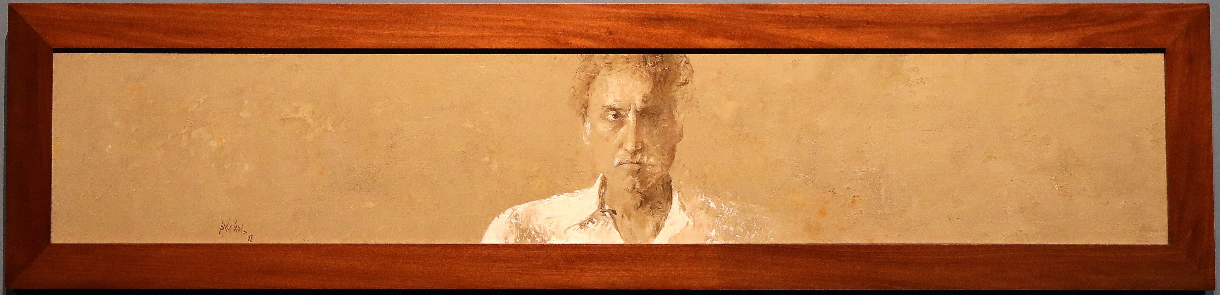 这幅创作于1971年的自画像采用了阿尼戈尼最钟爱的传统油性蛋彩画技术,洗练、坦率地描绘了自己的肖像。肖像以四分之三侧面角度呈现,阿尼戈尼把传统的弗拉画派技法和卡拉瓦乔追求的光线效果相互结合,并加以19世纪托斯卡纳肖像画善于捕捉人物内心活动的特点。