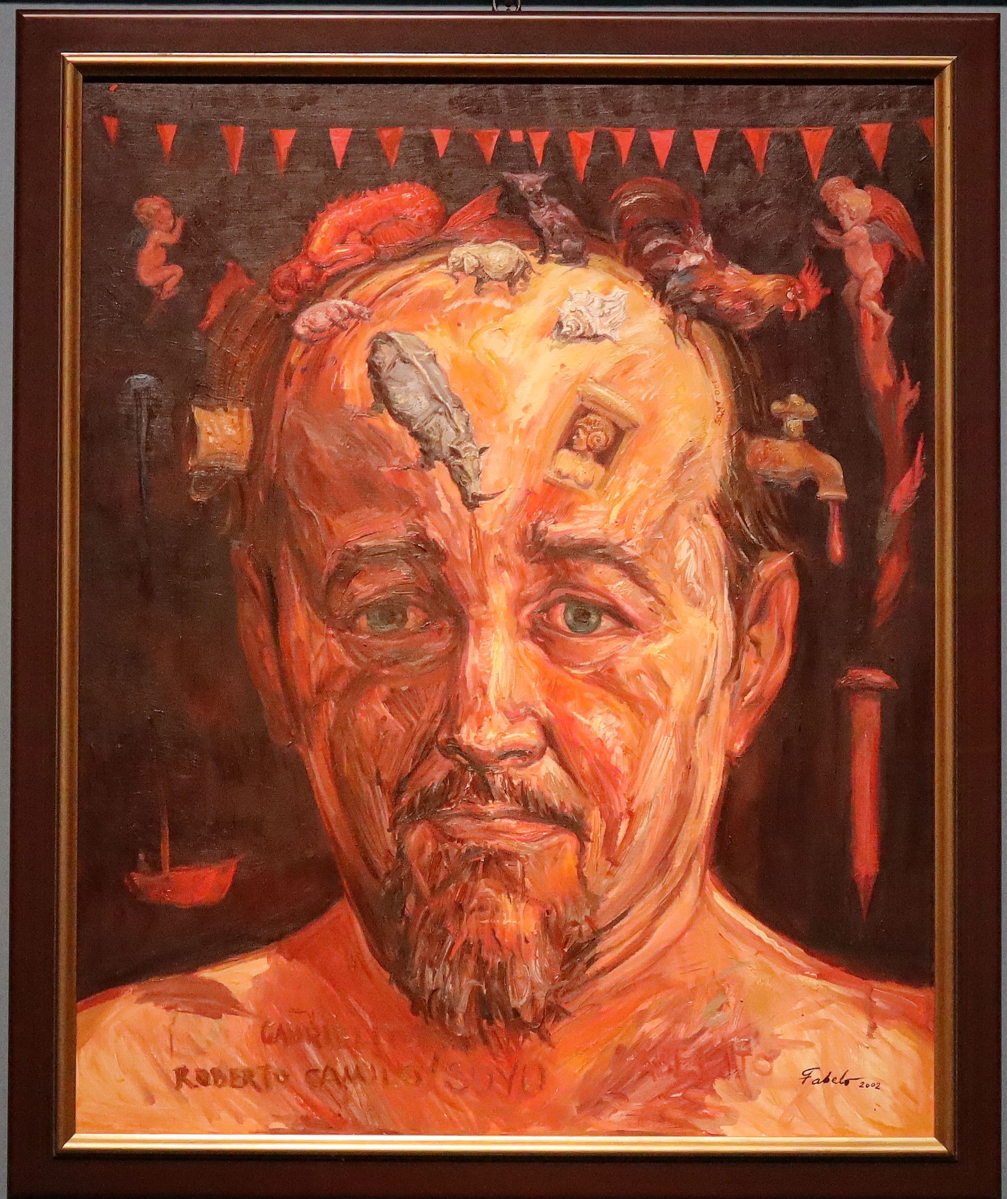 此画于2003年赠予乌菲齐美术馆。画面中,法韦洛用厚重且快速的笔触将自己的肖像绘于前景,经常出现在其插画、绘画和雕塑作品中的诸多形象似乎在他的脑中绽放,表达了艺术家狂野的想象力。这幅自画像充分体现出了他强烈的自发性和真诚感,在其众多作品中脱颖而出。