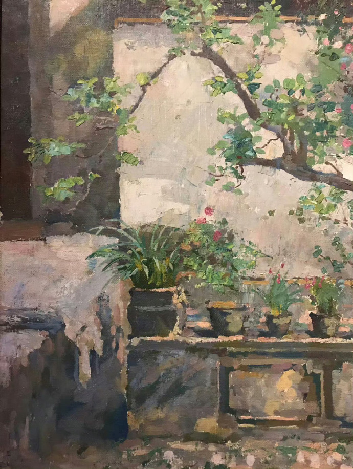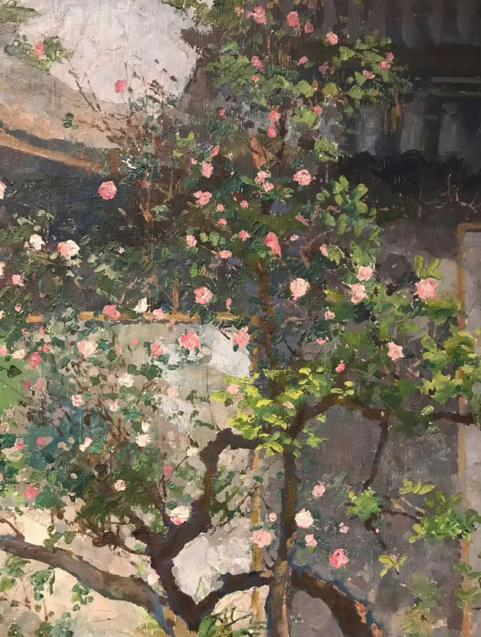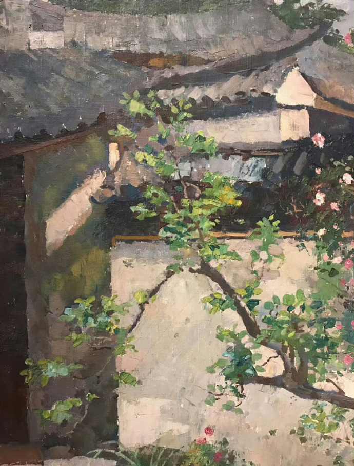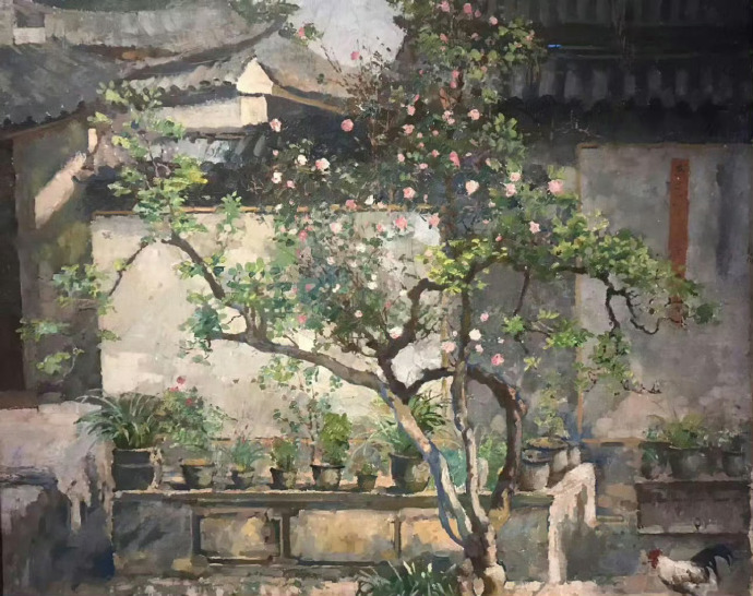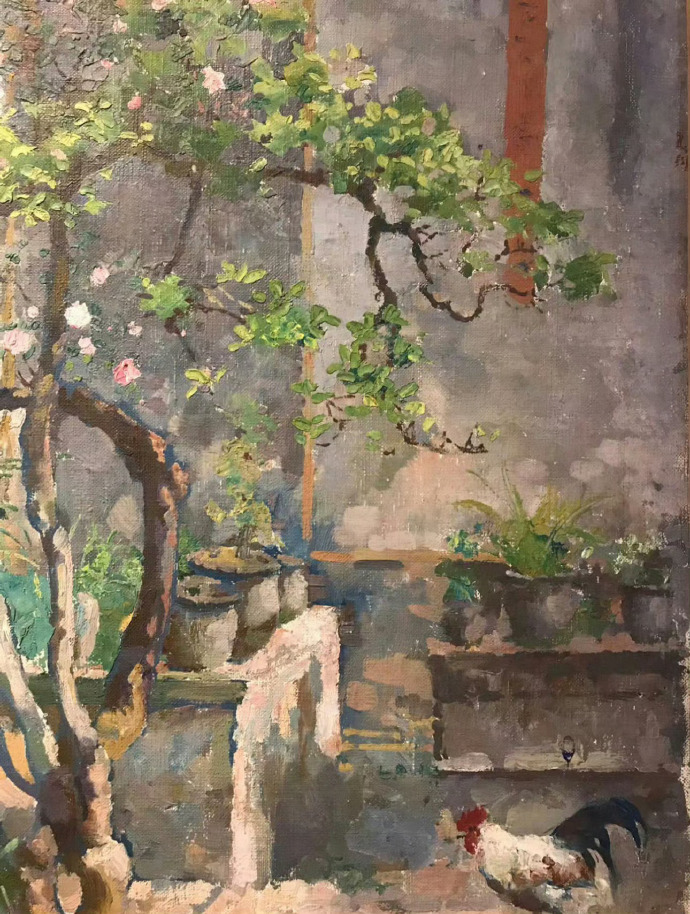 《庭院》描绘的是中国边疆云南鸡足山的一座庙宇,画面中的屋舍呈现出中国最常见的灰色调。徐悲鸿在这幅画中运用了他特有的色彩处理手法,通过调和多种颜色形成“脏”色调,使画面显得更加丰富而富有层次感。
