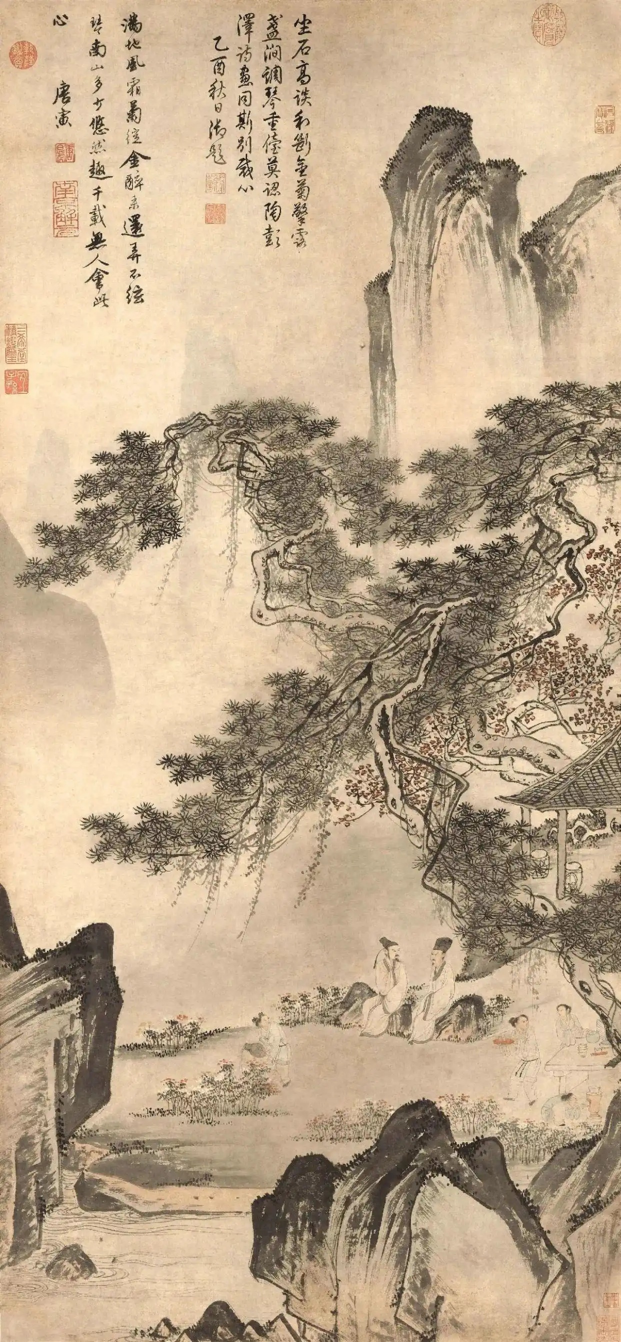 唐寅这幅作于 35 岁左右的画作,恰是其人生境遇的隐晦写照。此时的他历经科场舞弊案的打击,早已褪去少年得志的锋芒,心境更贴近归隐田园的陶渊明,于是,他便以陶诗入画,表达了他的慕陶隐逸之志。