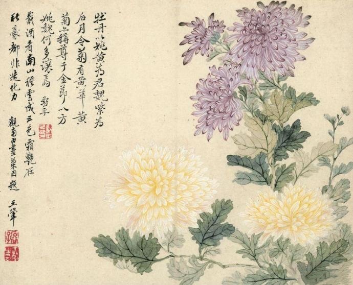 牡丹以姚黄为君,魏紫为后。月令菊有黄华,黄菊亦称尊于金节,以方姚魏何多让焉。 寿平。载酒看南山,种云成五色。霜艳在秋豪,都非造化力。观南田画菊因题。 王翚。