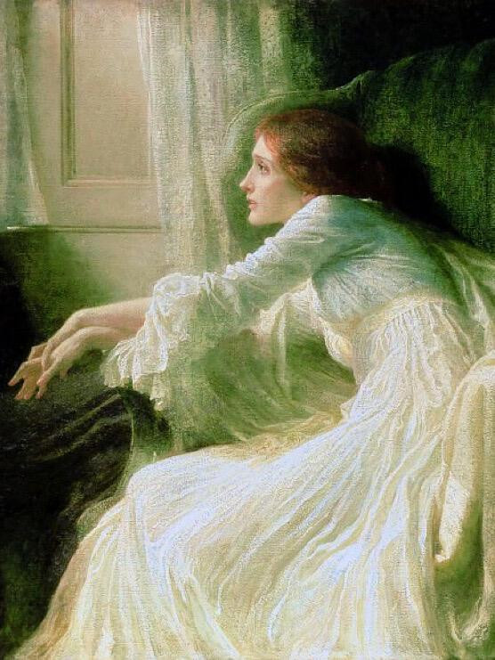 一束戏剧性的光芒从画面左侧倾泻而入,照亮了倚靠在扶手椅上的少女。她身着的白色长裙在光线下仿佛被镀上一层圣洁的光晕,褶皱处流淌着珍珠般的光泽。而隐没于暗处的男子深色的衣着几乎与背景融为一体,唯有那只扶额的手被微光捕捉,承托着他所有的挣扎与无声的忏悔。画作通过光与影、纯洁的白与压抑的黑,构建出一种充满张力的微妙平衡,仿佛一个未被言说的秘密在空气中凝固。