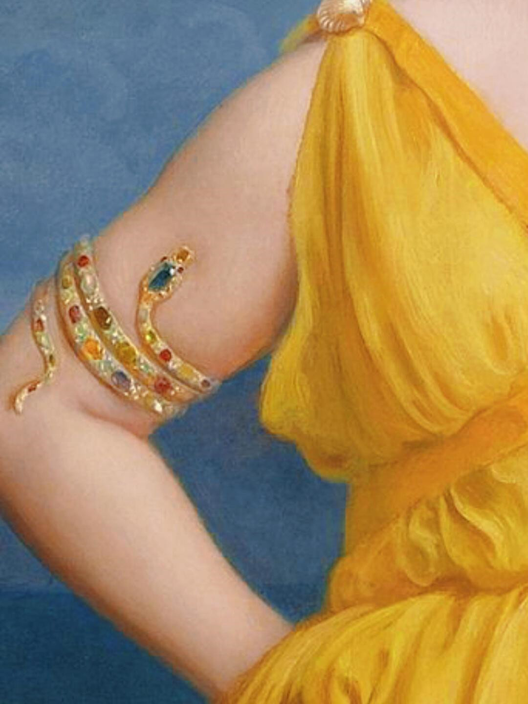 画中女子右臂缠绕的蛇形臂环上,镶嵌的彩色宝石宛如它蜿蜒途中邂逅的星河:蛇首镶嵌的祖母绿,仿佛是藤蔓初生的脉搏,深邃而充满生机;点缀其间的红宝石,炽烈而神秘。