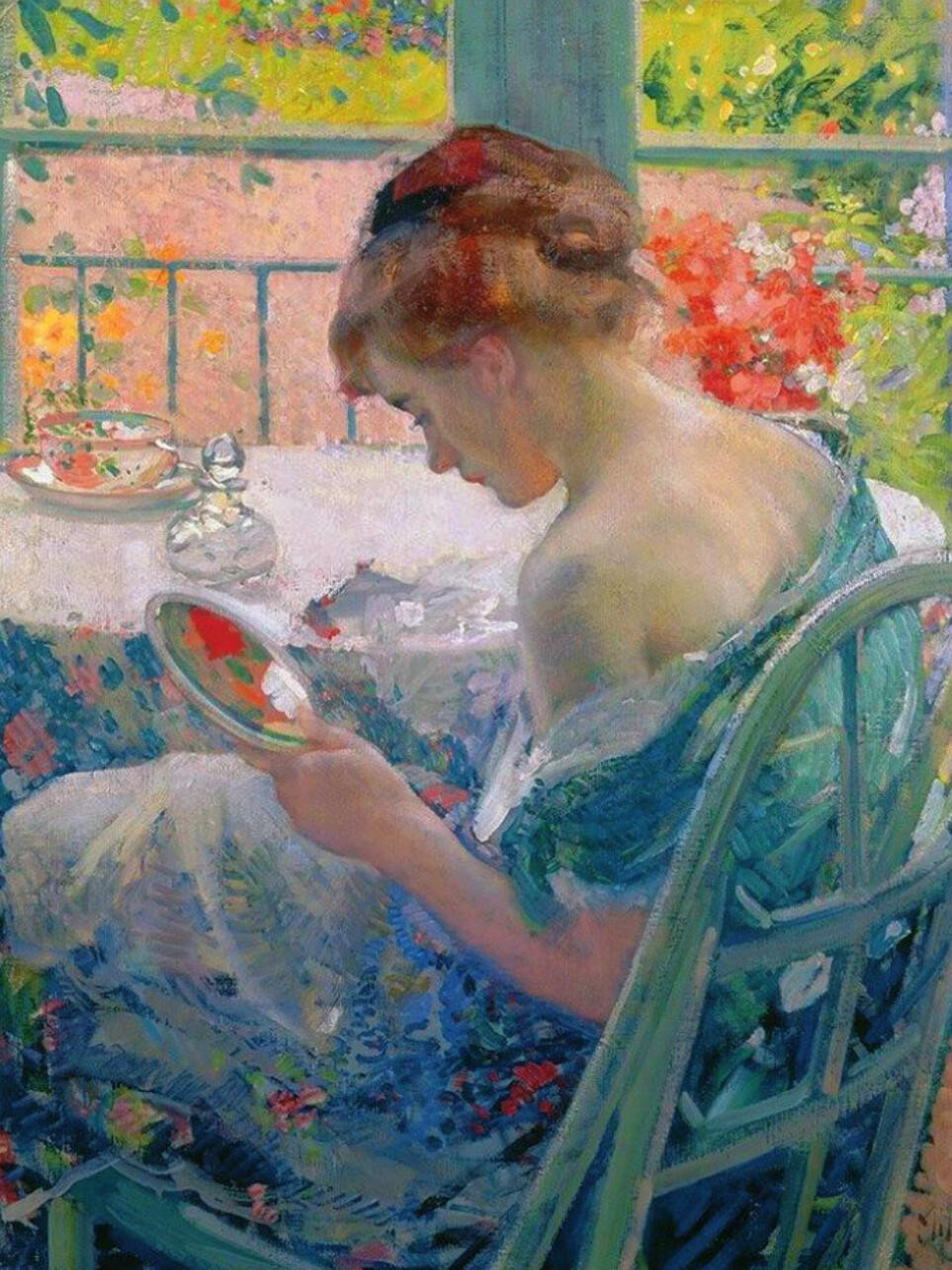 理查德·爱德华·米勒(Richard E.Miller,1875-1943年)是美国印象派画家,以描绘优雅女性、室内场景和阳光花园著称。他的作品色彩明快、笔触细腻,融合了印象派的光影效果和装饰性的构图,展现出独特的唯美主义风格。