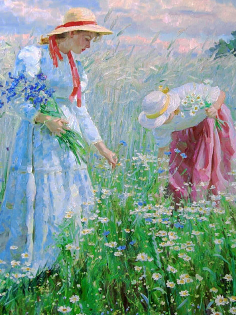 亚历山大·艾文(Alexandr Averin,1952— )是俄罗斯当代浪漫现实主义画家,以描绘田园诗般的乡村生活与古典少女形象闻名。他的作品融合了俄罗斯传统写实技法与法国印象派的光影处理,画面充满宁静的怀旧情调。