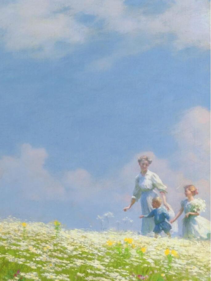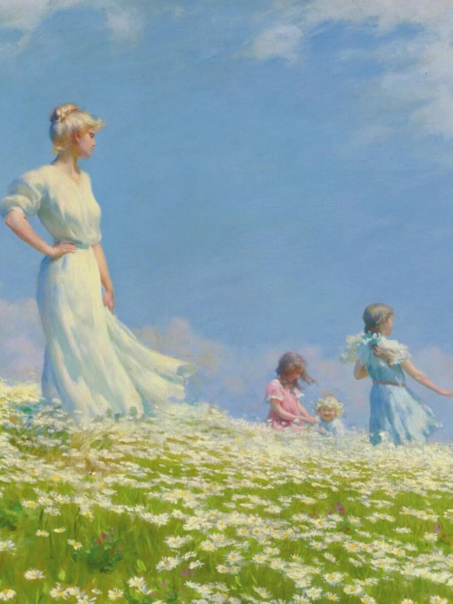 查尔斯·考特尼·柯伦(Charles Courtney Curran,1861–1942)是美国印象派画家,以描绘优雅女性与阳光场景闻名。他的作品充满清新空气感,擅长捕捉自然光线下的瞬间诗意,尤其喜爱表现女性在花园、湖畔或野外的闲适姿态。