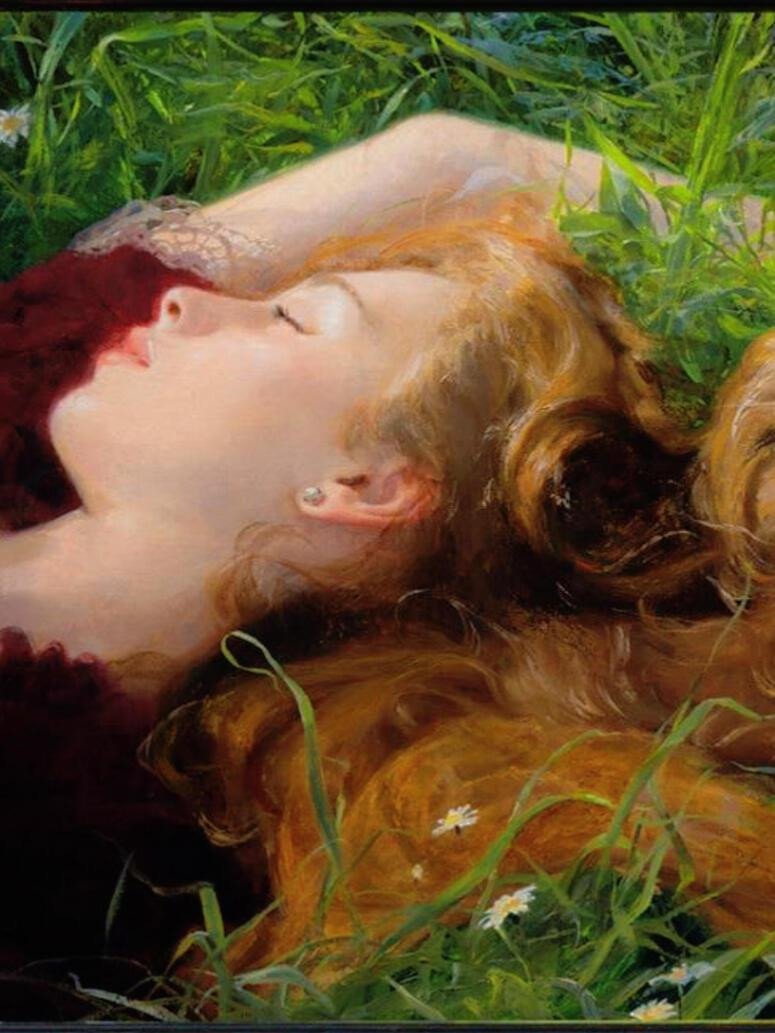 女孩如一滴露珠般静卧于绿野,星星点点的雏菊在她身旁摇曳。她的长发如瀑般披散,与嫩绿的草叶交织在一起。温暖的阳光轻抚着她的脸庞,为她白皙的肌肤镀上一层柔和的光晕,粉嫩的嘴唇在光线下显得格外动人。微风拂过,雏菊轻轻摇曳,整个画面洋溢着宁静祥和的自然气息。