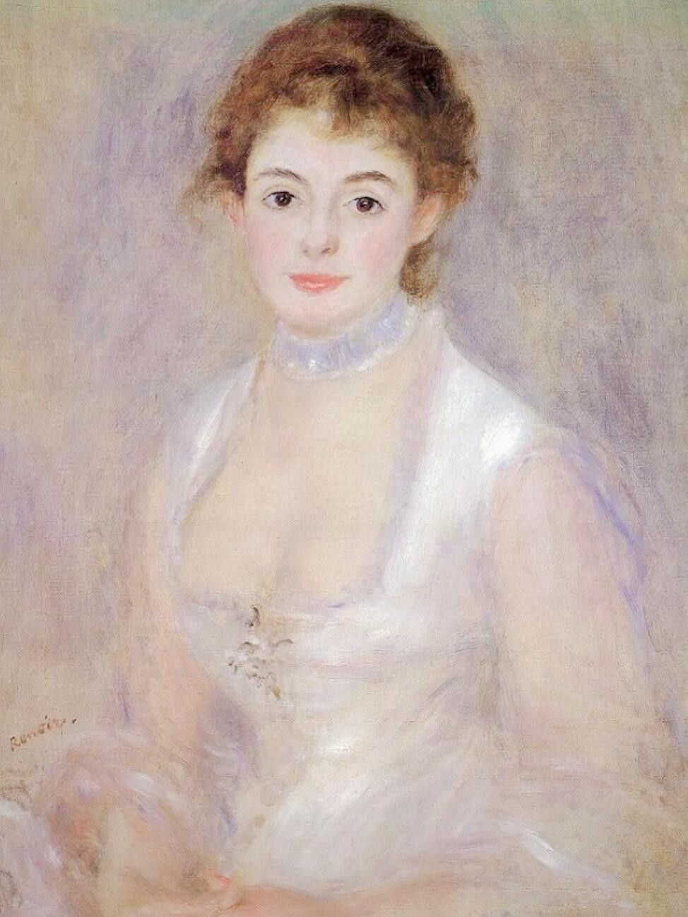 画中端坐的是亨里奥夫人,她泛着珍珠光泽的脸庞上,一双明眸成为最动人的焦点,半透明的纱质衣袖被白色与淡紫色的轻柔笔触勾勒。雷诺阿将古典肖像的庄重与印象派的灵动技法完美融合,在这方寸画布间,一位女性既作为艺术客体被完美呈现,又作为鲜活个体焕发着温暖的生命力。