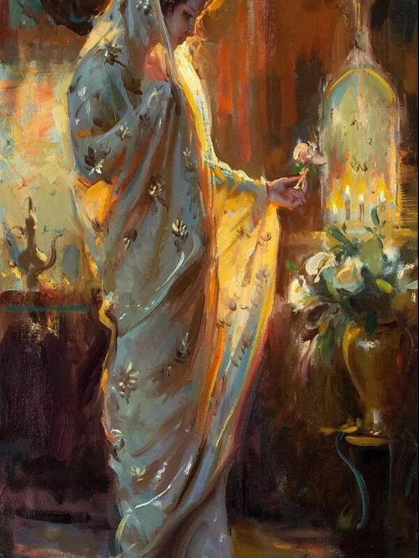 格哈茨善于通过柔和的自然光塑造女性形象,无论是晨雾中的侧影还是黄昏下的回眸,人物肌肤仿佛被镀上一层薄釉,兼具雕塑的质感与油画的温润。这种处理既延续了萨金特对光线的敏锐,又融入了拉斐尔前派对理想美的追求,使平凡女性焕发近乎宗教画的圣洁光辉。
