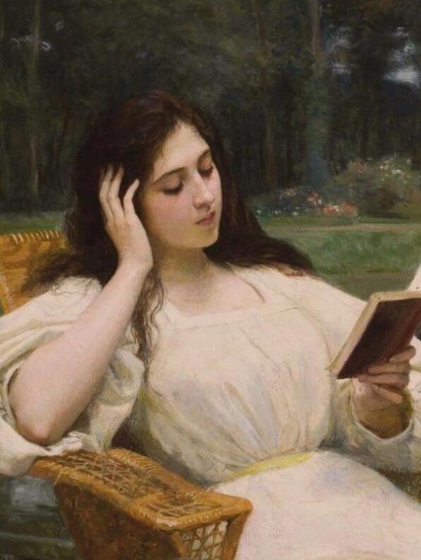 远山如黛,层林叠翠,一条蜿蜒的小河在逐渐昏暗的阳光下投射出丛林的静谧。河畔草地上,一把老旧的藤椅静静摆放,少女斜倚其中,一手托腮,一手轻执书页。她的姿态介于专注与出神之间——既像是被书中世界深深吸引,又仿佛沉浸在大自然的私语中。
