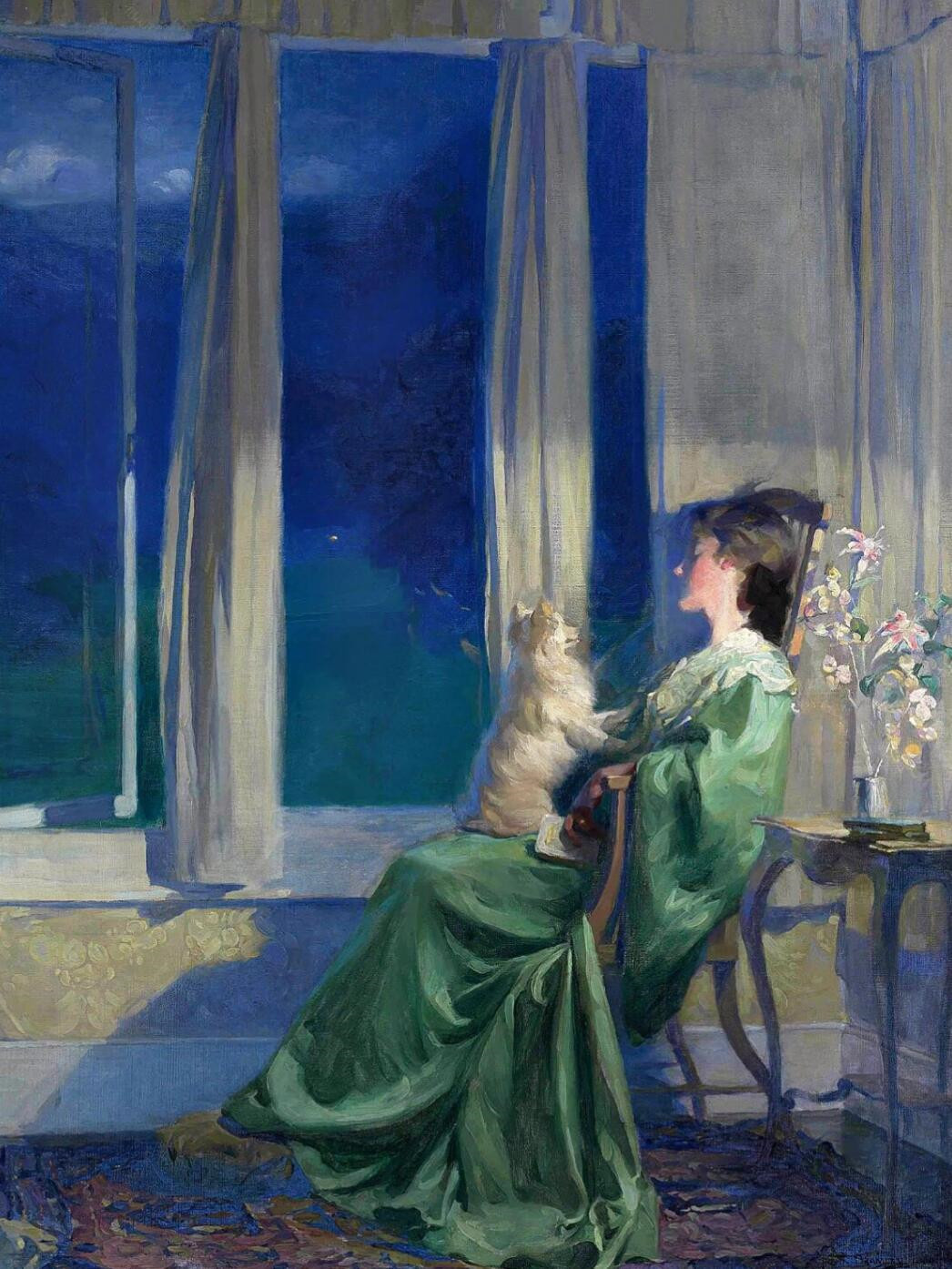 少女一袭翡翠长袍,坐在窗边藤椅中恬然休憩,膝上小狗如绒球般温顺。暮色在窗外流淌,月光为她轮廓描上银边。闭目的瞬间,时间仿佛凝固,衣褶垂落的弧度、交叠的纤指与均匀的呼吸,共同编织出一个静谧的绿意梦境。