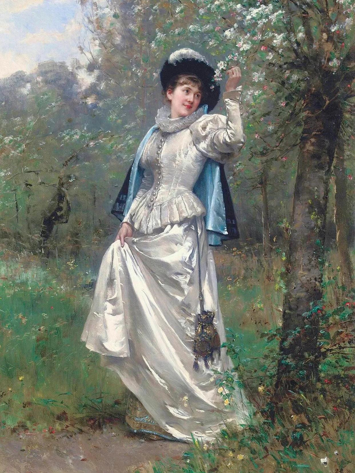 这是一个和煦的春天。贵族少女身披天蓝色披肩,走在林荫小路中,采撷初生的花朵。她服饰精致,穿搭讲究,帽子上的羽毛静静服帖乖巧,腰间的刺绣香囊与花朵相互呼应,一起烘托着岁月静好的春日诗篇。