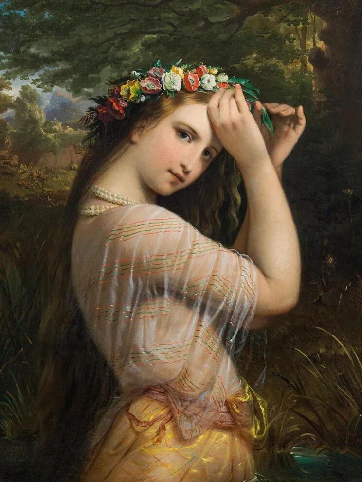 如何找寻内心的平静?也许花园里的一小支花,就能带来一整天的快乐。美丽的姑娘侧着身体,手里拈着五彩的花环。半透明的纱衣点缀着花朵倾洒下的彩色细线。她微笑地看向观者,似乎在讲述着森林里的美丽传说。