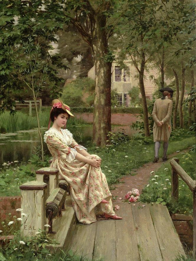 小桥流水、绿荫葱葱,这么美好的春光却被浪费在不开心的事情上。这幅画中的淑女穿着18世纪的款式花裙,头戴三角帽,写实程度相当细腻,尤其是对淑女的神情把控上,十分微妙。生着气闷闷不乐的坐在桥凳上,女子身边地上散落着的花束,证明之前与着背对离开的男子闹着不愉快。男子垂头丧气地顺着通。