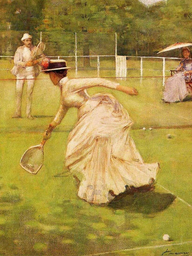 女子穿着维多利亚时代的时尚服装,仍然活力四射地打着网球。尽管服装精致而繁复,但丝毫没有束缚女子快速移动的脚步——参与运动的精神,压过了“封建”的眼光。