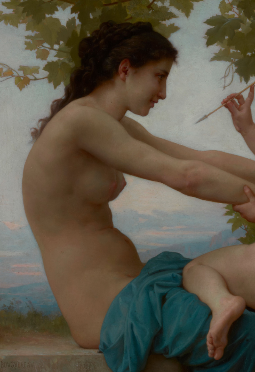 布格罗对少女和孩子的身体描绘得栩栩如生,树叶、石头和丝绸的肌理也被他处理得细腻入微。爱洛斯的金色卷发在阳光下闪烁着光泽,与树叶的绿色形成了鲜明的对比。