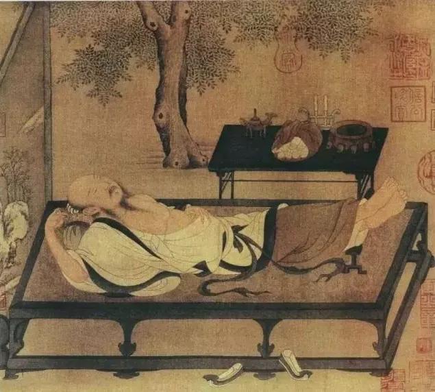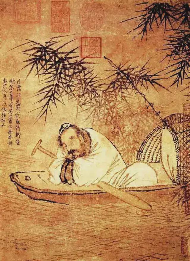 马远的人物画存世作品不少,其艺术造诣甚高。其人物画的鲜明特色是注重刻画人物的神态和心理活动。此图显示出马远的富有创造性的卓越构图技巧和特定的环境气氛与意境的表达,画面单纯,一老渔翁怀抱木桨,蜷伏在船头酣睡。