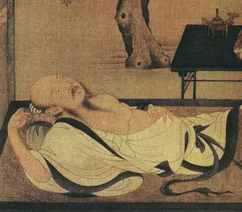 石恪,五代末宋初画家。字子专,成都郫县(今属四川省)人。图中表现慧可、丰干二位禅宗祖师调心师禅时的景象。慧可为禅宗二祖。画卷中,双足交叉趺坐,以胳膊支肘托腮的便是慧可,另一幅画丰干坐于温驯如猫的老虎的背上。