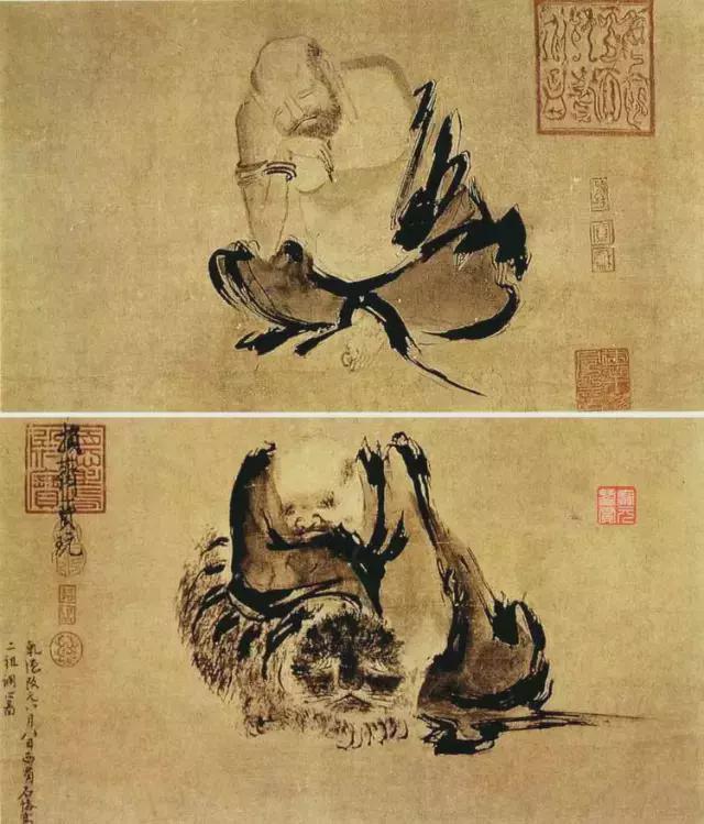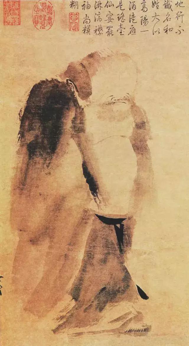 梁楷既能依精妙严谨的图画,又擅用笔极简、洗练放逸的“减笔”画。梁楷在技巧上的重要创造,开启了元明清画家写意人物画的先河。这幅作品,用酣畅的泼墨画法,绘出仙人步履蹒跚的醉态,用简括细笔夸张地画出形象奇怪生动,似有幽默感的沉醉神情,令人叫绝。