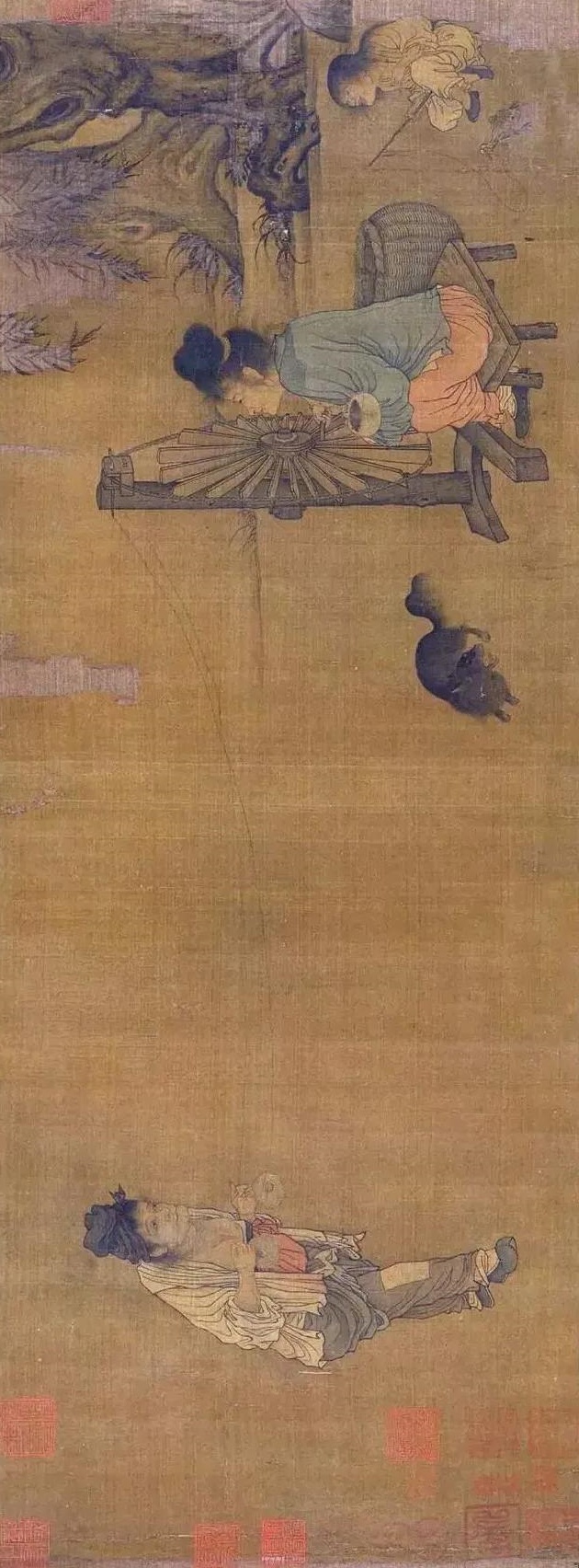 ▲《纺车图》宋 王居正 绢本设色 纵26.1厘米 横69.2厘米 北京故宫博物院藏