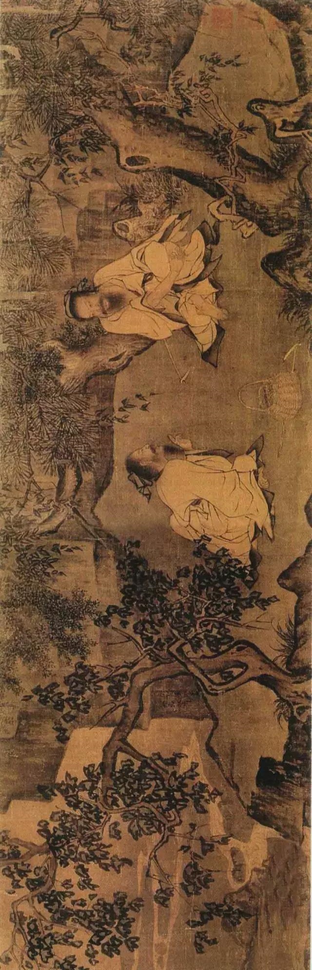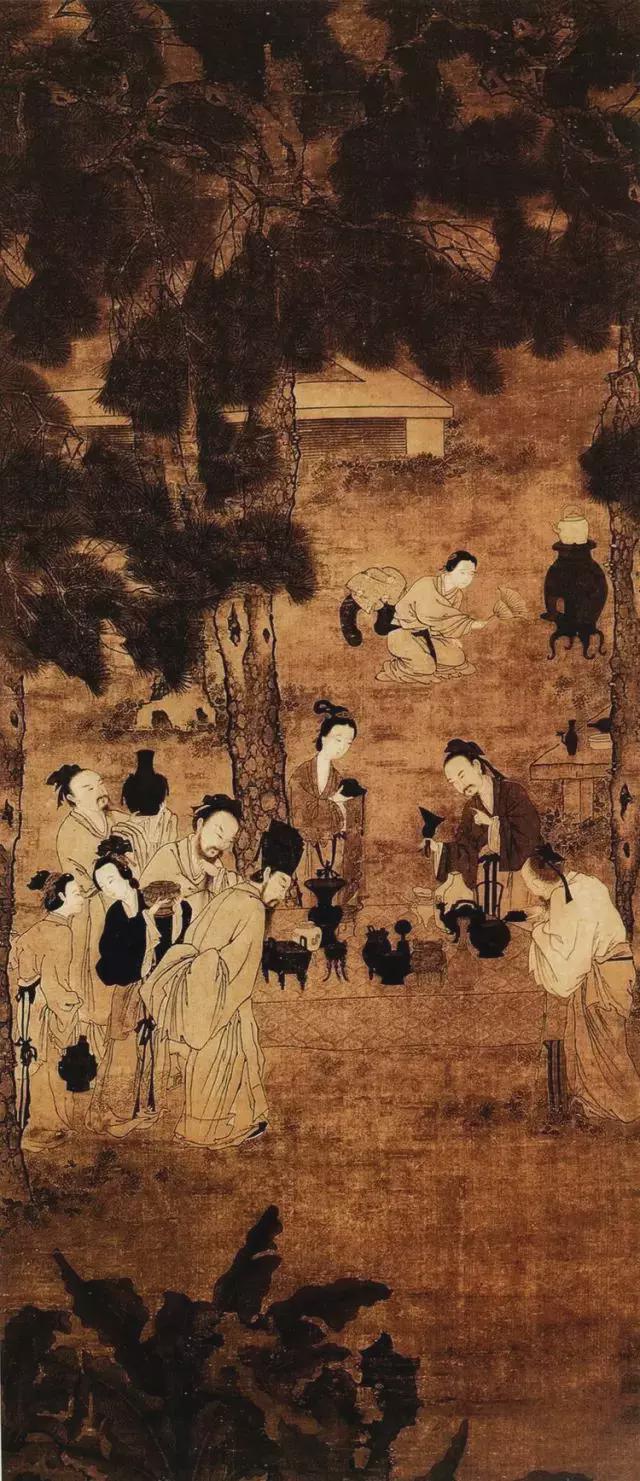 此画以山水为背景,突出描绘人物,是一幅情景交融的人物画杰作。松树的主干与枝条具老嫩之别,万攒的松针更有一种茂盛感。在这种葱郁浓密的松林中,几个文人墨客正在把玩古董。把玩者神态各异,表情丰富。