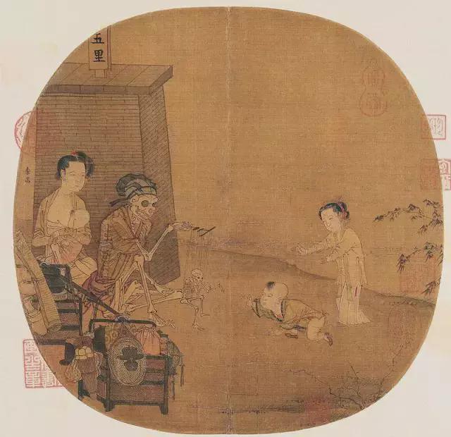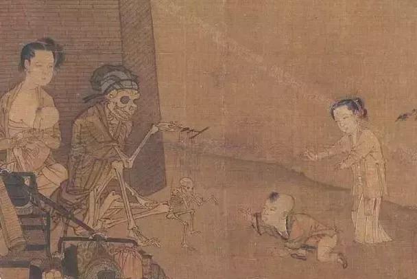 宋李嵩骷髅幻戏图,是南宋画家李嵩的一件名作。画面中一大骷髅席地而坐,用悬丝在操纵着一个小骷髅。这是宋代市井木偶表演形式之一种——悬丝傀儡演出。