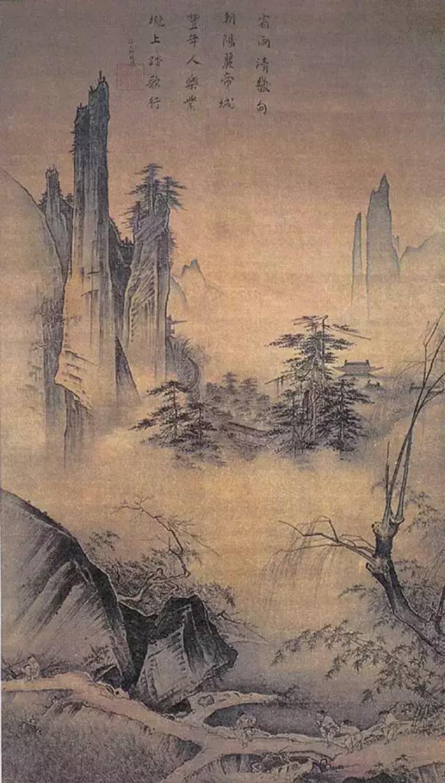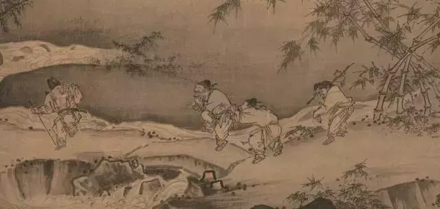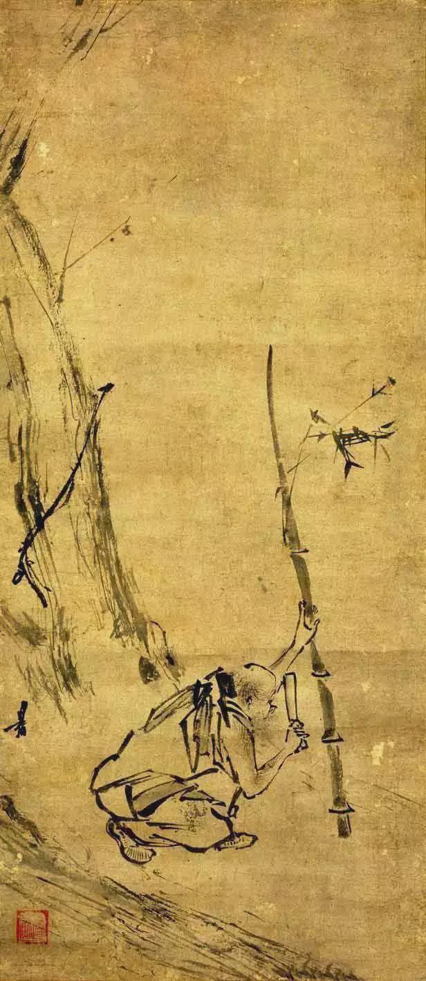 《六祖伐竹图》南宋画家梁楷代表作品,画家深入体察所画人物的精神特征,以简练的笔墨表现出人物的音容笑貌,以简洁的笔墨准确地抓取事物的本质特征,充分传达出了画家的感情,从而把写意画推入一个新的高度,使时人耳目一新。