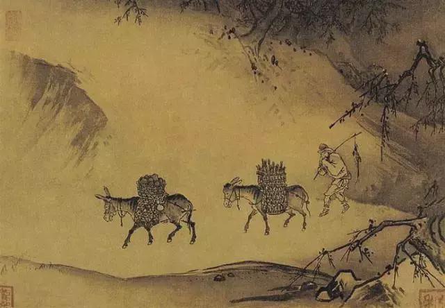 此图描写大雪封山的清晨,一山民赶着两只身驮木炭的小毛驴在白雪皑皑的山间行走,山民肩上还用树枝挑着一只打来的山鸡,似去赶集出卖这些东西以换取生活所需。山民衣着单薄,弓腰缩颈,使人感到雪天寒气逼人。