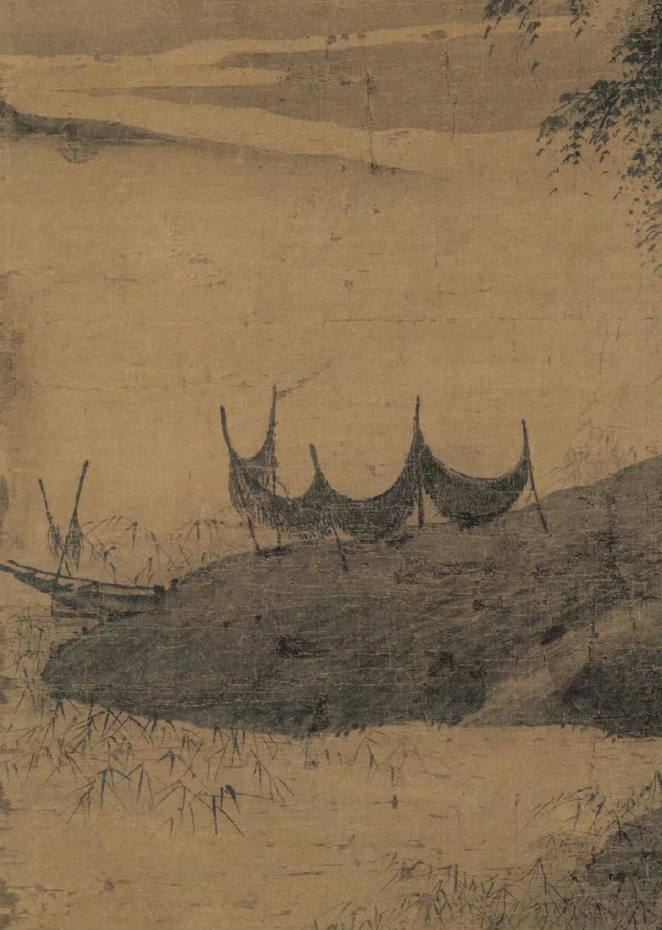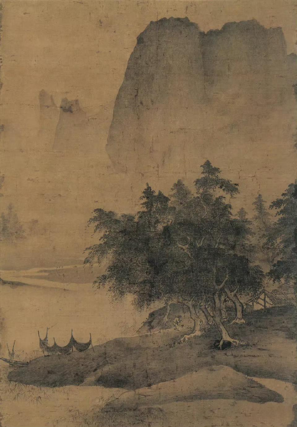 《雨余烟树图》描绘了江岸雨霁、渔人归家之景,充满了江南水乡的诗意与生活情趣。远景主峰苍劲巍峨,山巅用笔稳健厚重,随着山势下行,墨色逐渐虚淡,最终与江上水雾融为一体,营造出一种朦胧而深远的美感。中景江面平静,水雾缭绕,增添了几分神秘与幽静。近景小舟泊于溪边,渔网已晾晒完毕,渔夫携带渔获走向林木深处的茅舍,这一细节生动地展现了渔家生活的宁静与和谐。