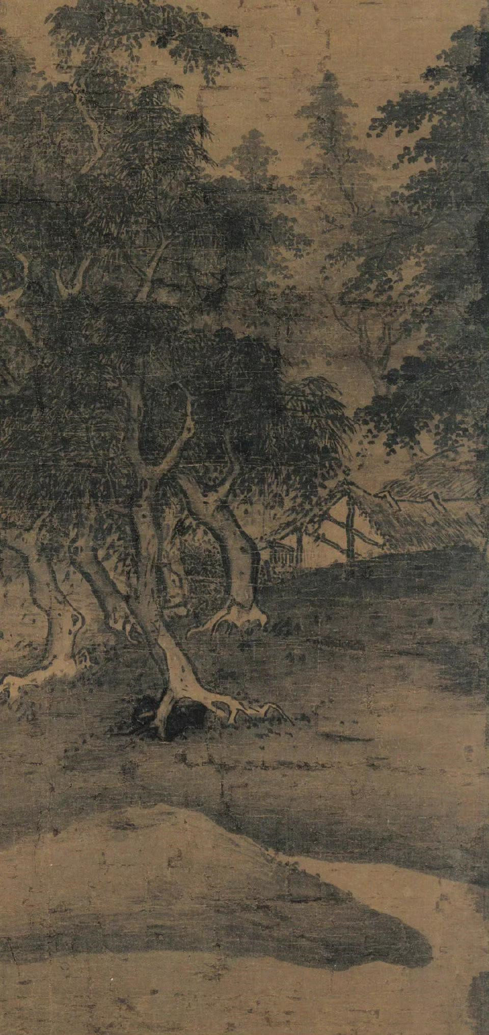 夏圭用笔苍老雄放,善用秃笔带水作大斧劈皴,人称“拖泥带水皴”。在《雨余烟树图》中,这种技法得到了充分的展现,山石皴擦自然流畅,墨色变化丰富,既有浓墨重彩的厚重感,又有淡墨轻染的清新雅致。同时,他善于调节水分,使得画面墨色淋漓滋润。
