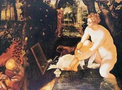 在众多对此题材的描绘当中,当属丁托列托的这一张《苏珊娜和长老》最为著名,丁托列托用艳丽的色彩和迷人的光线表现出苏珊娜光滑闪耀的肌肤,自然流畅的姿态,她那耀眼的光彩恰好与阴影中偷窥的两位长老形成对比。这一题材如此受到欢迎是很容易理解的,它既迎合了艺术赞助人和观众的色情观看欲望,又能够通过最为正当的理由将这一世俗需求合法化,和其他一些题材如《达纳厄》和《卢克蕾提亚》一样,提供了绘制女性裸体的借口,很少有其他艺术主题能提供如此令人满意的偷窥机会,长老们的偷窥行为无疑给这个题材添加了色情意味,而我们这些画外的观者事实上也成为偷窥的同谋者。约翰·伯格在《观看之道》中就曾指出这一题材反映出的性别问题,苏珊娜作为观看的对象出现在艺术作品中,其目的正是要讨好作为观看主体的男性。两个好色的长老既提供了图像的合理性,又增加了色情的效果,滔滔不绝地证明了男性的自我意识。