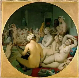 英国笔记作家蒙塔裘女士随着丈夫前往伊斯坦布尔出任驻土耳其大使,她1717年4月1日写给朋友的信,描述了她在索菲亚城第一次看见土耳其浴的情景:圆顶的石造澡堂内,200多位妇女都一丝不挂。但在那里,丝毫没有轻狂的嬉笑和挑逗的动作。有的人喝咖啡,有的人吃果冻,或由仆人帮忙梳头编发。这场景何其震撼,激发了包括安格尔、夏塞里奥等艺术家的创作热情,留下了丰富的土耳其浴室题材作品。
