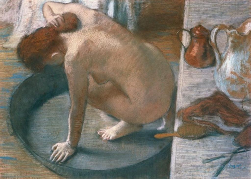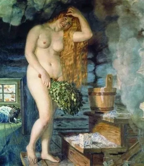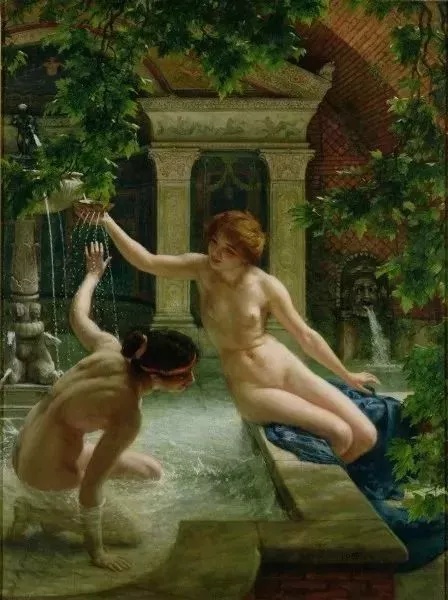 表现了两个正在沐浴的青年女子,她们正在嬉闹,展示出胴体的娇美,也流露出天真无邪的品性。浴室内光线柔和,装饰华丽,侧光把侧身斜坐女子的丰满苗条渲染得淋漓尽致,而反光则将正在洗浴的女子丰满的身体突出出来。画面以写实为主,强调了光色、冷暖的关系与对比,营造了一个温馨的世界。