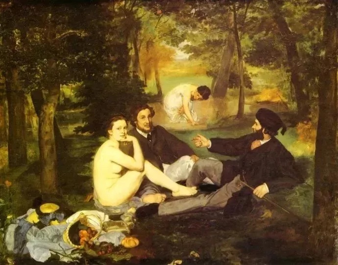 1863年,在巴黎展出的《草地上的午餐》,是仿效卢浮宫乔尔乔奈的《乡村音乐会》的构图。画家让裸体女郎坐在林中草地上,与两位穿衣绅士为伴,后面还有一位正在洗浴的女子。这是一种经过精心安排的“午餐”,是画家寻求色彩对比的大胆实验。此画展出后,引起舆论大哗,作为挑战性作品,马奈被推入到印象派阵营。