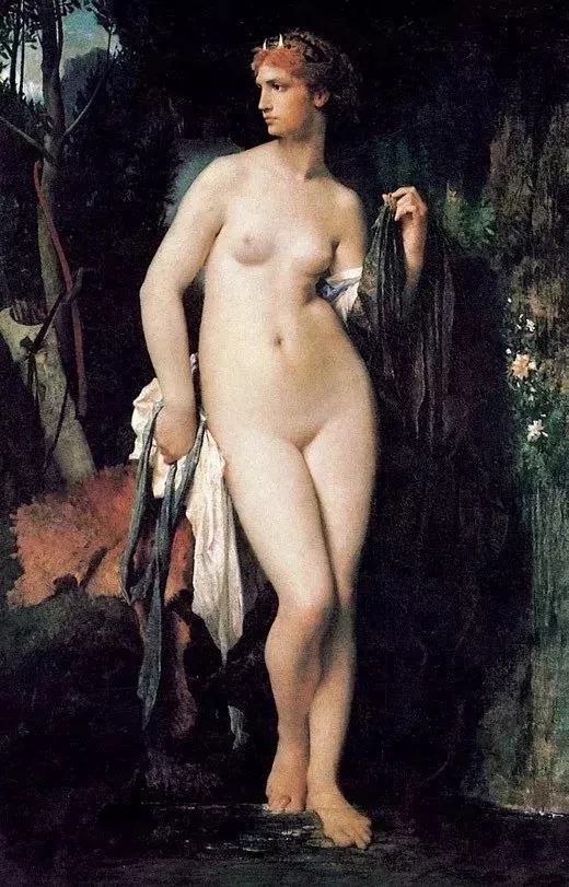 如果没有背景里的弓、箭、豹皮,以及人物头上的弯月形的标志,这幅画完全是一幅洋溢着浓郁的新古典主义气息的人体绘画习作,而没有任何神圣的气息。画家追崇安格尔优雅的古典主义线条及略呈S 形的人体造型,又以较强的明暗对比,塑造出一种含蓄内敛、古希腊雕像般的美感。