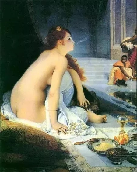 此画中,热罗姆描绘了浴池里的东方女子,体态窈窕,吹着水烟筒,这是东方阿拉伯人的习俗,周围建筑体现了阿拉伯风格。圆柱、细密的图案、喷泉等与洗浴的女子、波斯花纹的地毯,共同构成了阿拉伯情调,表现了"东方主义"的浪漫诗意。