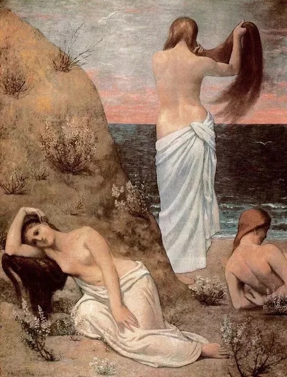 这是一幅抒情而优美的浪漫主义作品。画家描绘了十几个美丽少女,围坐溪边,似乎欲下水洗浴,有的半*裸,有的欲脱衣。画家把不同性格、气质的少女组织在一起,强调个性,又要找出共性,去体现那种生命之美。在无序中实现有序,繁纷中实现统一,是这幅作品的成功之处。