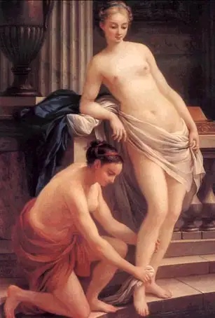 古典主义画家常借沐浴情节描绘美丽的女性人体,传达自己的艺术追求和美学观念。波因特遵循古典主义的原则,继承了自古希腊到文艺复兴杰出的艺术大师人体造型传统,塑造了一位维纳斯式的裸女形象。画家以极工丽的装饰造型,细致地描绘周围环境,复杂的纹样组成了富有东方情调的空间。细腻单纯的人体动势呈全开放式地立于画面中间,她在五颜六色的背景衬托下显得鲜明突出。画家创作这类题材的画,真正含义是想让观赏者去欣赏在这个美妙的环境中展现的人体的独特美感。