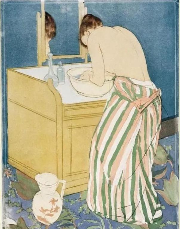 这幅画作以细腻的笔触和丰富的色彩,生动地描绘了女性洗澡的场景。画面中的女性形象优雅而自然,仿佛在淡淡的香水中沉浸,享受着洗澡的惬意。卡萨特的创作风格在这幅作品中得到了完美的体现,她巧妙地将日本主义的艺术元素与印象派的绘画技巧相结合,形成了一种独特的艺术风格。